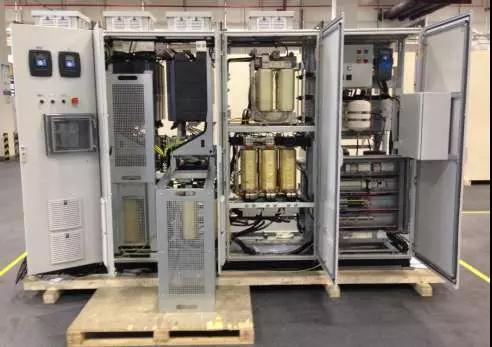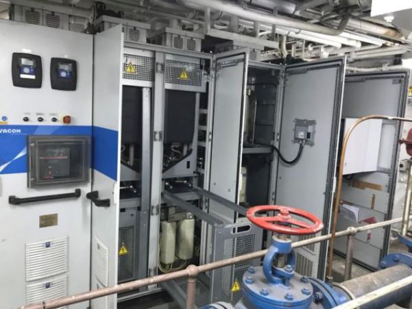 每条船上配备1套500kW的轴带发电机及500kW变频器,作为PTO应用输出功率。在轴带发电机输出电压和频率不稳的情况下,通过变频器可以稳定地输出固定电压和频率,这样可以与柴油发电机组长期并网,或者单独运行给船舶负载供电。与轴带发电机配套的500kW变频器采用双AFE水冷变频方案,均由丹佛斯海盐工厂组装成柜。