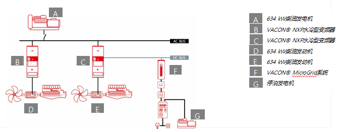 推进器和发动机系统:2台推进器,每台采用2台三菱634 kW柴油发动机 + 两台由2个VACON® NXP水冷型变频器控制的285 kW Baumüller电动力矩电机。