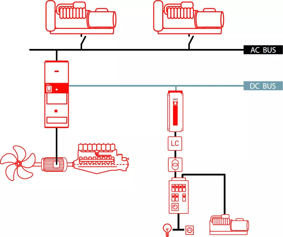 在传统的直接驱动配置中,柴油引擎和推进器之间有一个机械连接。所以,推进器速度与引擎速度成正比。也就是说,很多情况下引擎并非在最佳作业条件下运行。通过柴油电力混合驱动可以大大减少这种低效率运行,因为发电机和推进器之间存在电力转换。电力转换使得推进器的速度和变桨能够得到优化,与机械转换相比大幅提高了效率。