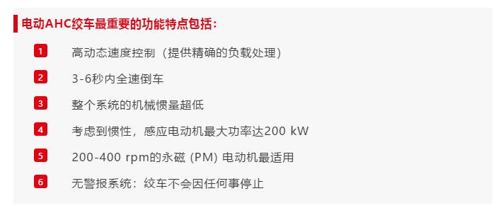 挪威是海底石油工业高科技研发的领先国家,其石油设备必须在深达3000米的海底工作。挪威的专业领域之一是配备主动升沉补偿 (AHC)  技术的绞车,该技术被用于起重设 备,通过主动补偿相对于海床的所有运动来降低海浪影响。AHC绞车系统能补偿任何导致电缆突然松弛或拉扯的起伏或剧烈的海上运动, 从而实现安全可控的负载部署和回收,提高安全性并降低与天气相关的停机时间。AHC绞车系统的发展趋势是更大的尺寸和电气驱动。