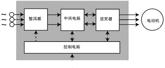 变频器是把工频电源(50Hz或60Hz)变换成各种频率的交流电源,以实现电机的变速运行的设备。如图1所示,其中控制电路完成对主电路的控制,整流电路将交流电变换成直流电,直流中间电路对整流电路的输出进行平滑滤波,逆变电路将直流电再逆变成交流电。对于如矢量控制变频器这种需要大量运算的变频器来说,有时还需要一个进行转矩计算的CPU以及一些相应的电路。