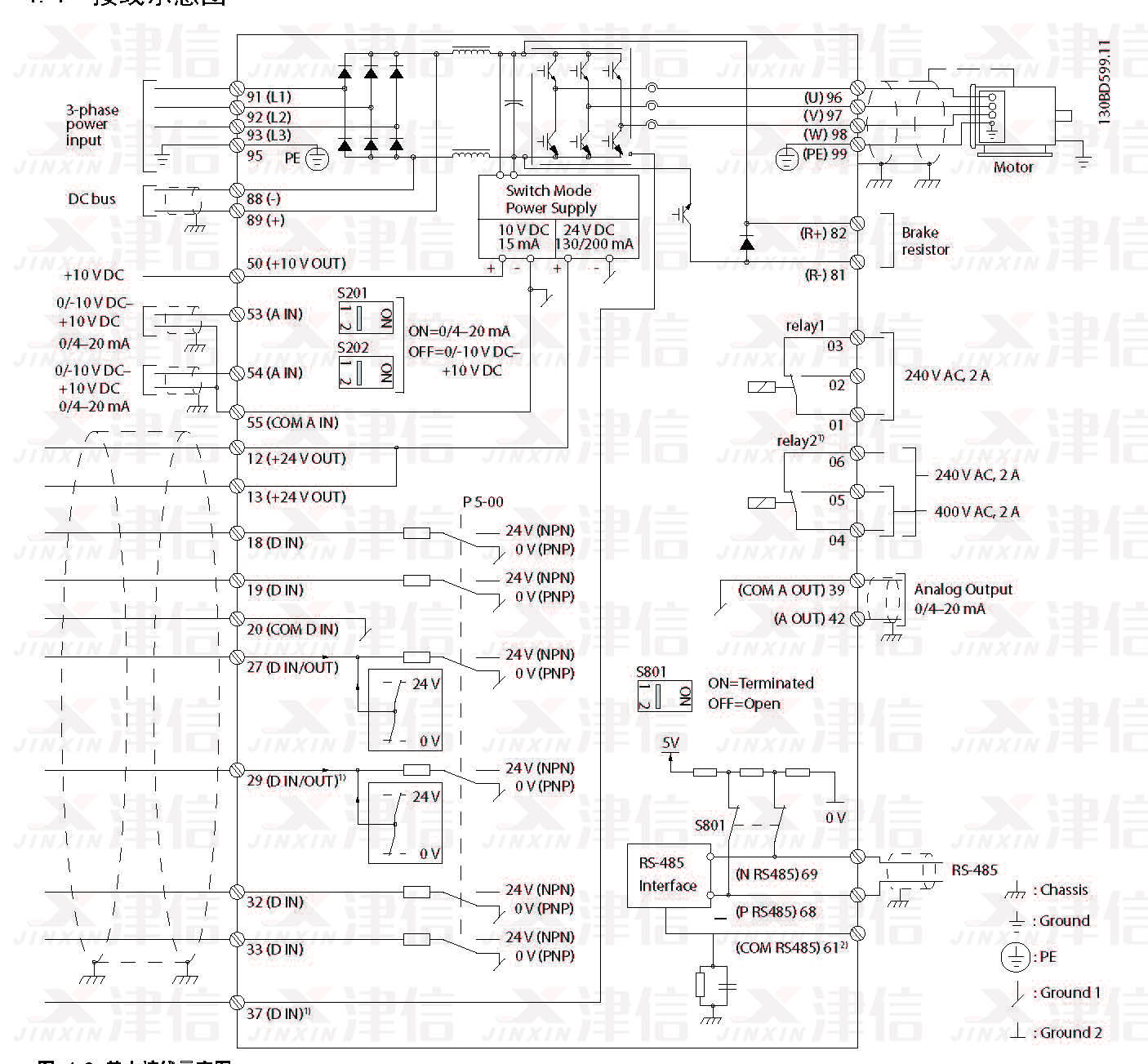 1) 内置制动斩波器仅在 3 相设备上可用。