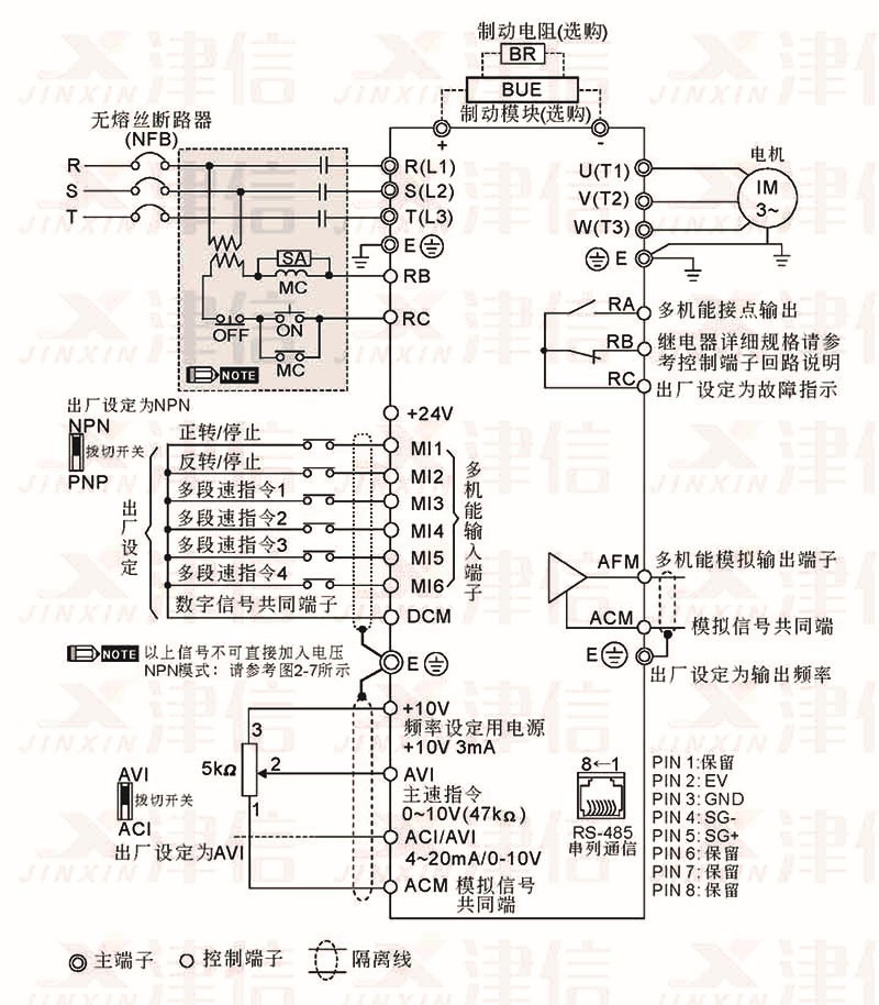 l 为了安全和减少噪声,230V 系列采用第三种接地(E ),460V 系列采用特种