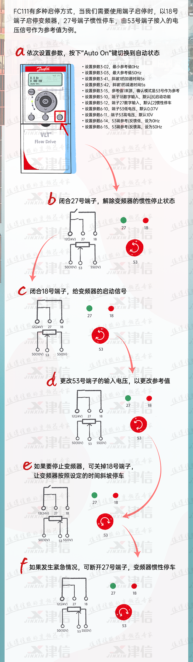 羞羞动漫在线观看有多种启停方式,以丹佛斯FC111变频器为例,当羞羞漫画在线观看需要使用端子启停时,以18号端子启停变频器,27号端子惯性停车,由53号端子接入的电压信号作为参考值为例。