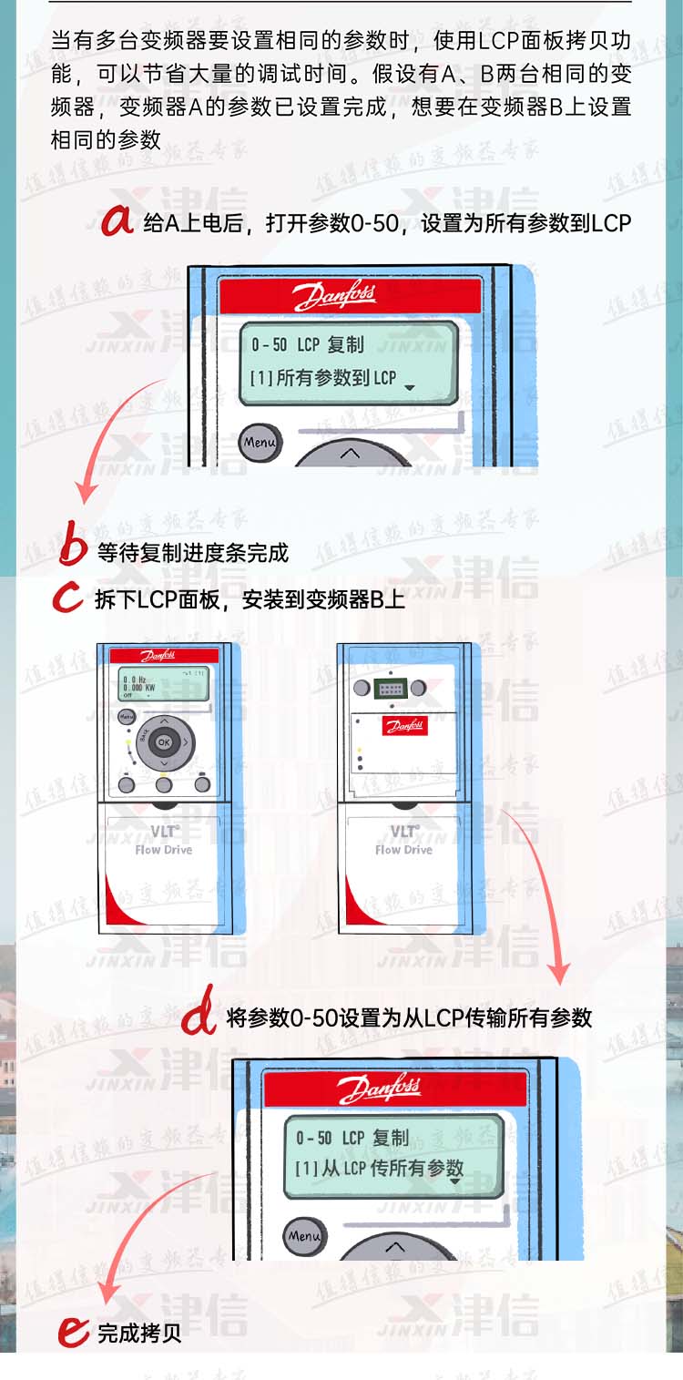 以FC111变频器为例,当有多台变频器要设置相同的参数时,使用LCP面板拷贝功能,可以节省大量的调试时间。假设有A、B两台相同的变频器,变频器A的参数已设置完成,想要在变频器B上设置相同的参数,可以按以下步骤操作: