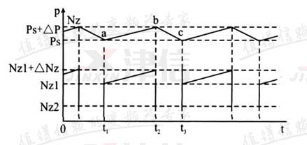 图1给出了λ = 0.7,Q0 = 10Q1时空压机的功耗和压力变化关系趋势图。式中Q0为空压机配套的储气罐容积,ps为满足用户需要的最低压力,Nz1为空压机供气压力在 ps时恒速运行的功耗,psp为空压机运行的最高压力,其中Δp为压力控制器的差动压力,Nz1+ΔNz为空压机在供气压力为psp时的功耗,Nz2 为空压机在空载时恒速运行的功耗。从图1中可以看到,当压力由a点上升到b点,空压机的功耗由Nz1上升到Nz1+ΔNz,显然空压机功耗的增加是由于Q2和Q1不相等造成供气压力上升所造成的,这可以从公式Nz=Mτ×n/973.2得到证明,式中Nz表示空压机轴功率,Mτ表示空压机转矩,n表示空压机转速。当压力上升时 , 由于转矩和 压力成正比关系 , 空压机转矩也随之上升 , 从而导致 空压机轴功率上升 ; 当压力上升到b点后,压力控制 器触发电磁阀关闭空压机进气,这时空压机进入空载状态运行,其功耗为Nz2 ,同时供气压力也开始下降,在供气压力下降到C点之前,空压机一直维持在功耗为Nz2的空载运行状态;当压力下降到C点后,压力控制器触发电磁阀打开空压机进气,空压机重新进入压力上升阶段,如此循环往复。