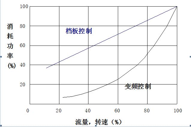 交流驱动系统实际使用时,可通过实测或根据其静态特性的理论计算,作出其转速对功率的特性曲线,由于转速与流量成正比,该曲线即流量对功率的特性,如图1所示。与档板调节相比较,可见其节能是显著的。