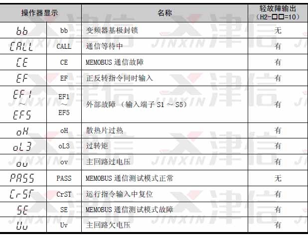 l 轻故障时∶进行多功能接点输出H2-01=10 (轻故障)的设定时,信号关闭。