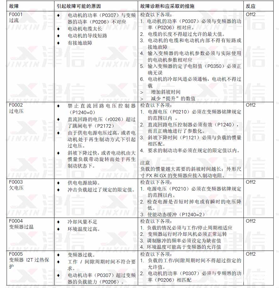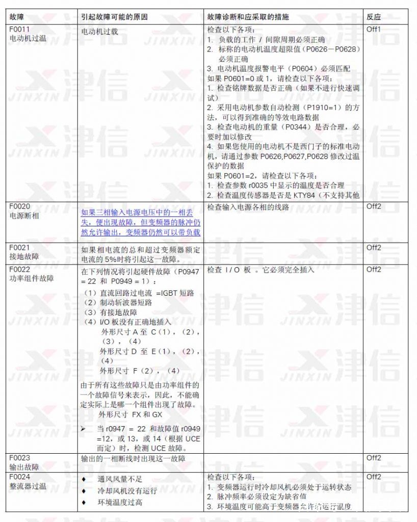 二、F0011电动机过温,F0020电源断相,F0021接地故障,F0022功率组件故障,F0023输出故障,F0024整流器过温