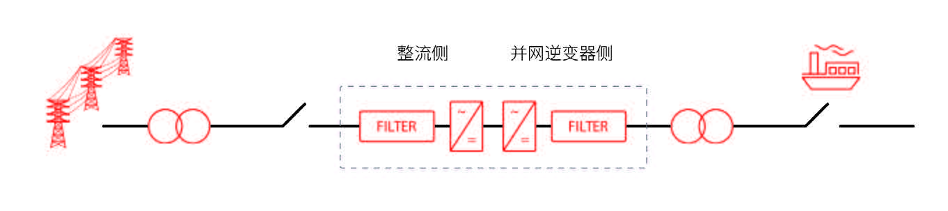 丹佛斯岸电电源系统通常包含岸侧整流装置和船侧并网变流器装置,如下图所示: