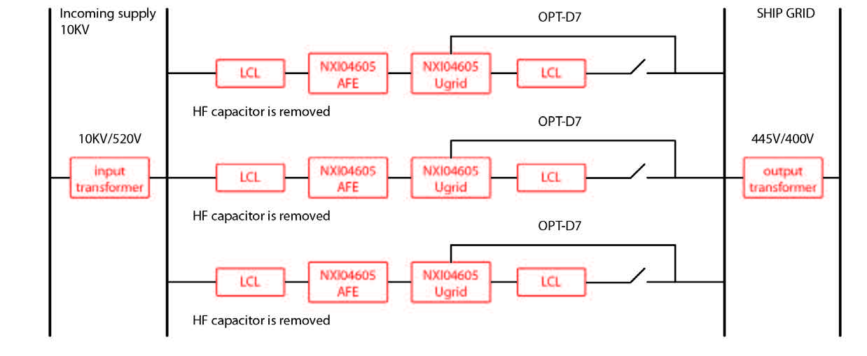 此项目并网电源采用VACON®NX系列共直流母线传动产品, 含3台AFE整流装置(310kW) 和3台并网变流器(310kW)。